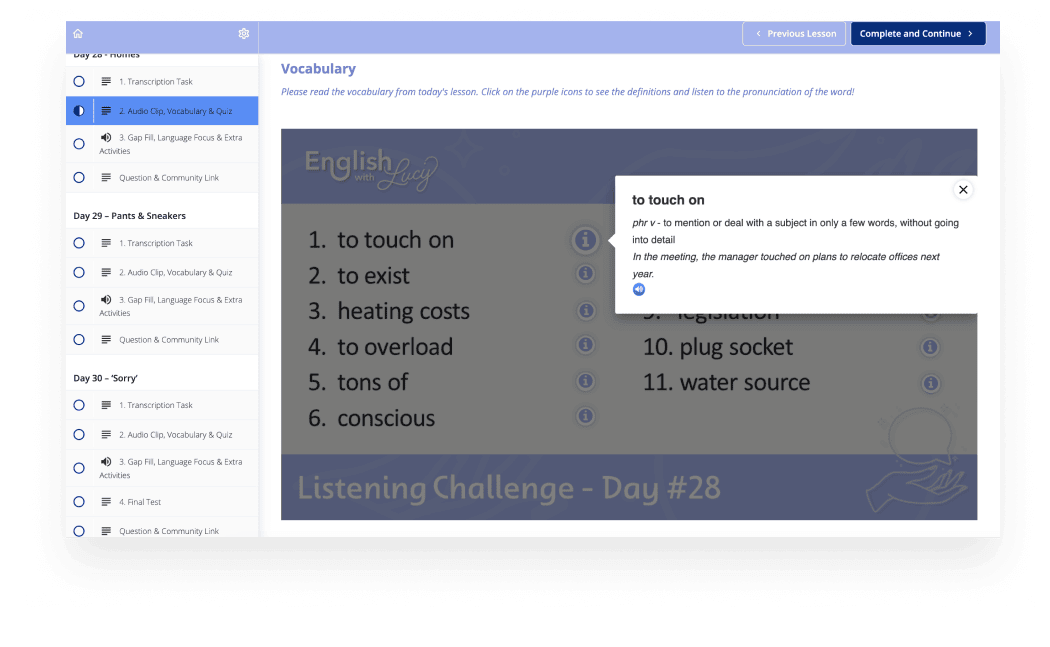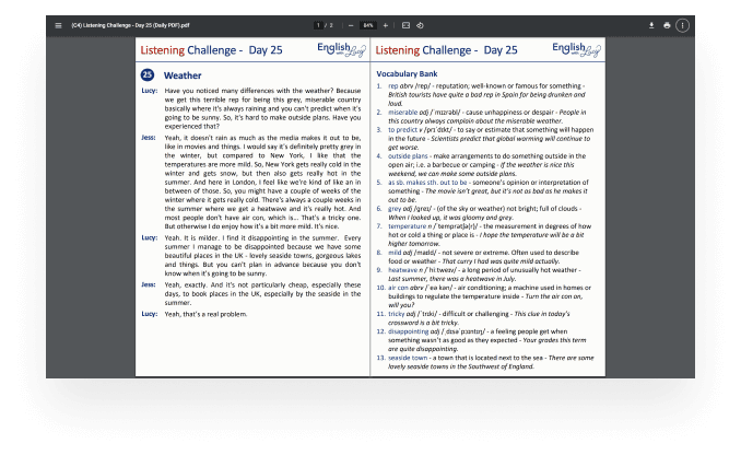 ✅ Each day we give you a downloadable PDF with the full clip transcript and vocabulary list!